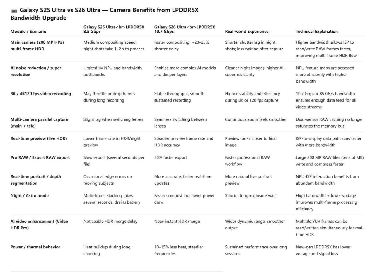 Увеличение скорости памяти напрямую скажется на общей отзывчивости системы и многозадачности. Но один из самых заметных прорывов произойдет в работе камеры, особенно в топовой модели S26 Ultra. Более быстрая передача данных позволяет реализовать ряд улучшений в обработке изображений и видео.
